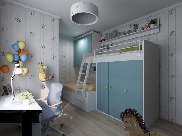 这款个性儿童房的上下床设计,节省空间又好看,美观实用。天蓝色的配色为空间编织一个调皮又温馨的氛围。