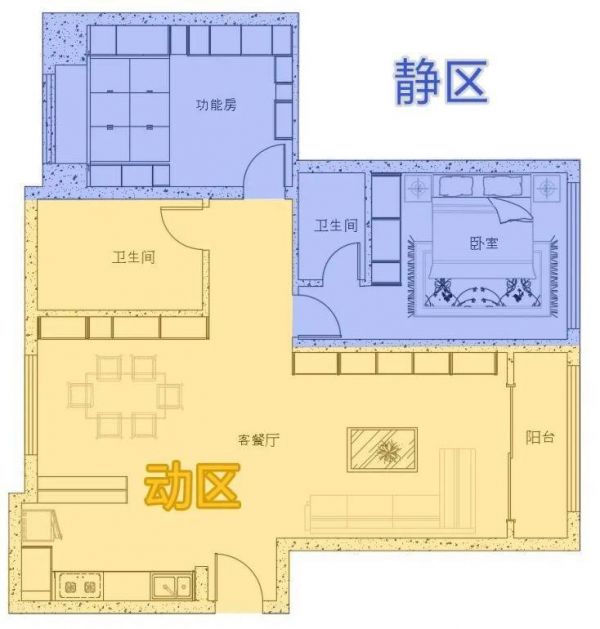 设计时要注意主人隐私,像卧室这样的私密空间最好尽量远离客厅等区域,同时做好动静分区,静区设置在屋子内侧最佳。