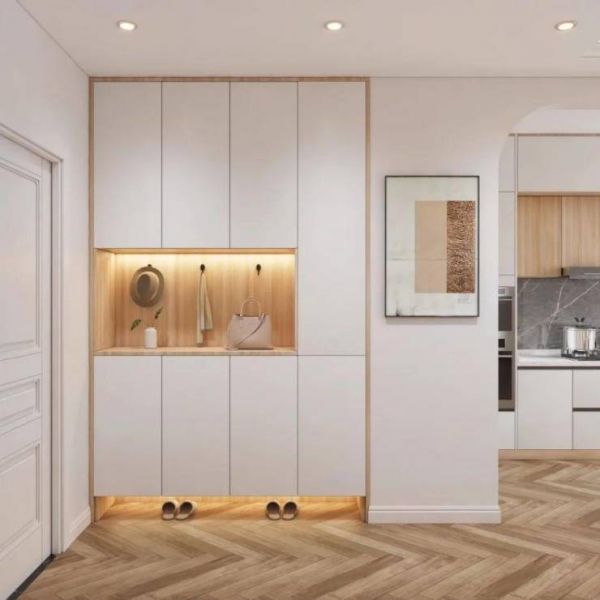 在玄关处安装感应式灯带、筒灯,主人晚上开门回家时会自动亮起,不用再摸黑开灯,主人离开时也会自动熄灭,非常实用。
