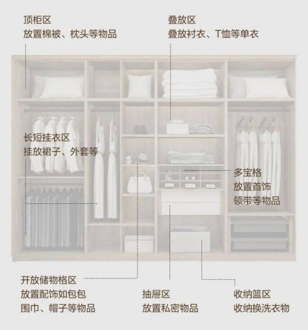 衣柜分区可以按照使用习惯分为挂放区、叠放区、抽屉区、被褥区,更细一点的还会区分长衣区、短衣区、裤架区等等,但具体的分区还是要根据自身的需求来确立。