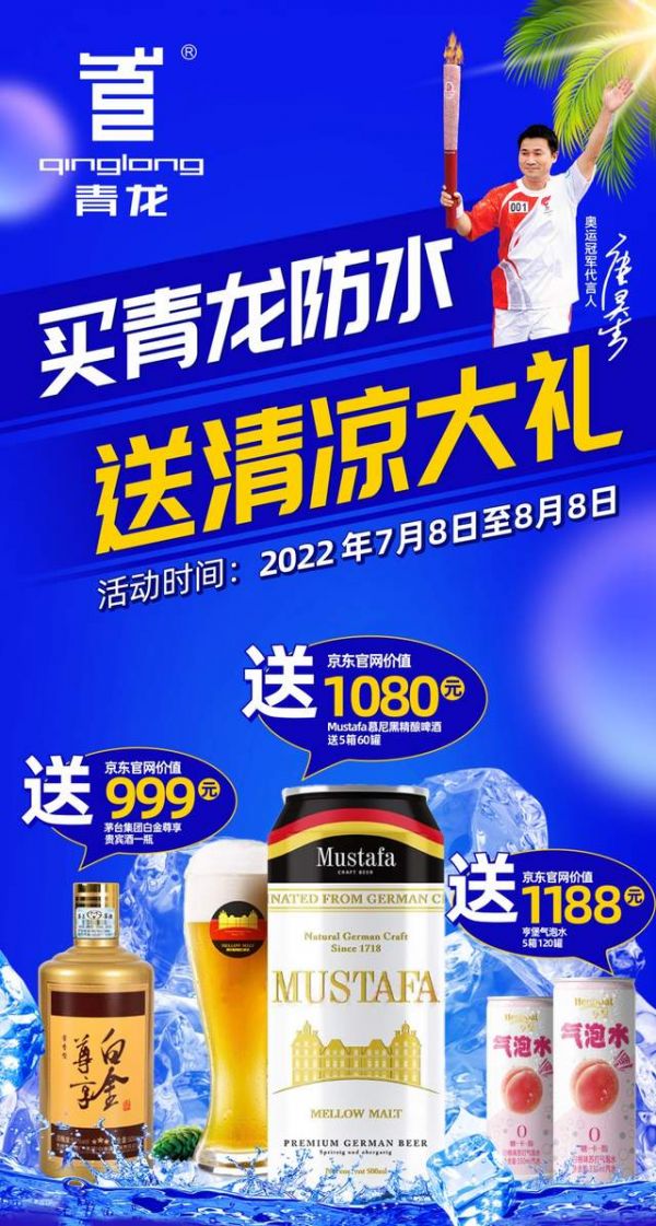 送5箱共60罐Mustafa慕尼黑精酿啤酒(京东官网价值1080元)和5箱共120罐亨堡气泡水(京东官网价值1188元)再加茅台集团白金尊享贵宾酒1瓶(京东官网价值999元)。