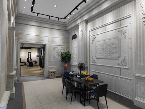 宏伟、高雅的舰店外立面,以别墅整装设计思维,依托中式艺术线条的东方美学神韵,营造理想的家居空间。与内墙样板间不同,外墙展示区以文化感、真石质感打造,融入松鹤延年、天下第一福、山花等中国传统文化元素,成为旗舰店一道风景线。