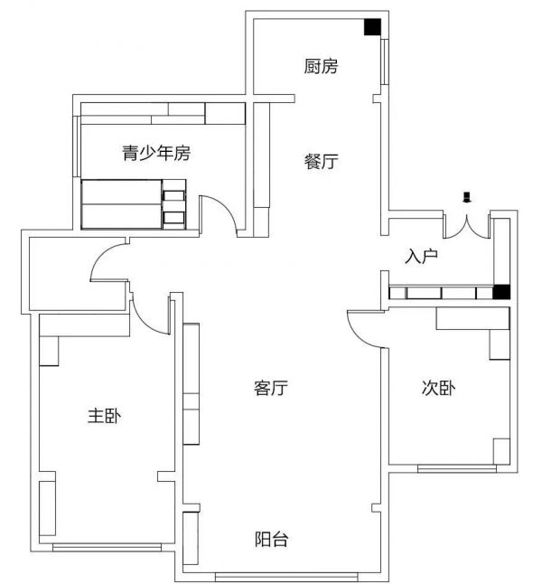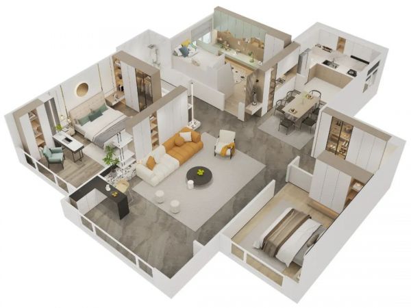 设计亮点:1、超高门板+无拉手设计,柜体简约大气;2、打通隔断,阳台改造为书房、休闲区;3、悬空衣柜设计,轻盈通透,实用性强;4、儿童房上床下柜,充分利用空间利用率。