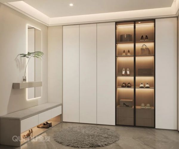 进门见柜,顶天立地式玄关柜轻松装下一家的鞋物。左侧定制换鞋凳,底部留空更方便,搭配全身镜,便于整理仪容。