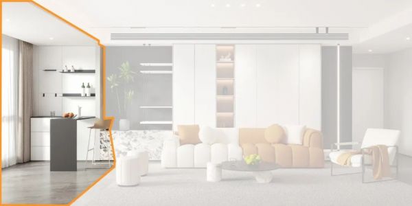 客厅沙发墙定制超大储物柜,超高门板+无拉手设计,空间整洁干净,搭配置物架,完美平衡收纳与展示功能。设计师在黑白的主基调上,选择了奶白+橙色的沙发为客厅重心,干练而不失活泼感,空间更显温馨。