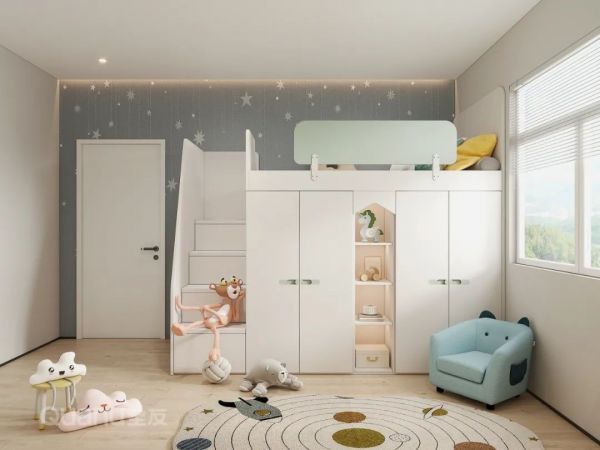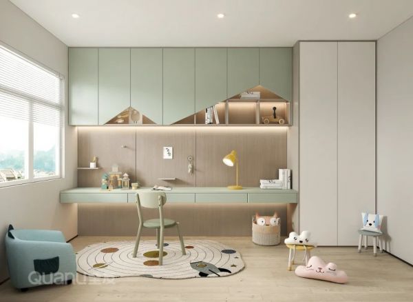 儿童房采用了全友“未来派+·发光星球”系列,湖绿与米白相搭配,清新简约。设计师选择上床下柜设计,上床是休息区,下方是衣柜,内嵌式拉手避免了磕碰,步梯抽屉柜还可以收纳小件衣物,大大提高空间利用率。