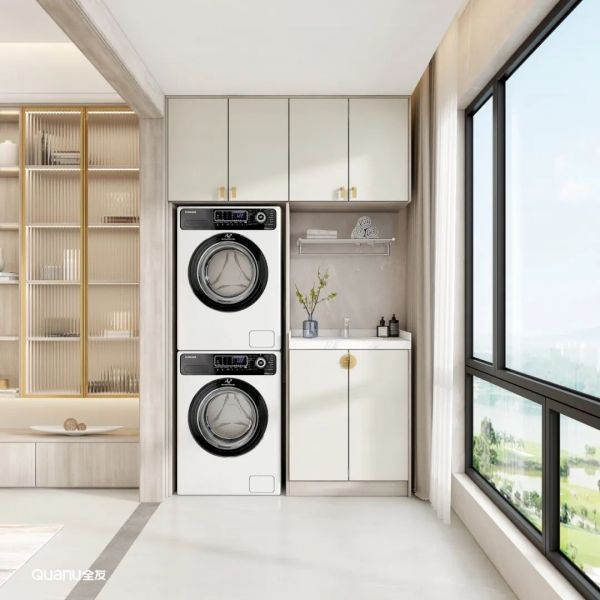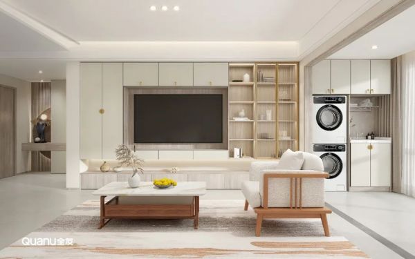 阳台事先预留出洗衣机和烘干机的位置,而后定制吊柜和储物柜,洗衣液、毛巾、清洁工具……皆可收纳于此,洗手盆的存在方便随手清洗物品,洗晾更得心应手。