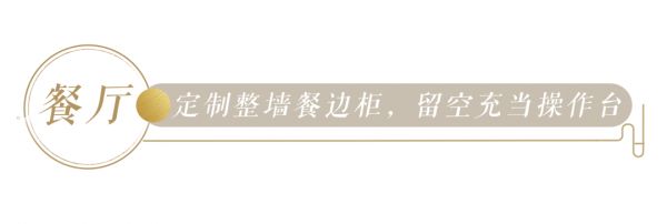餐厅定制整墙餐边柜,中部留空,预留出操作台,可将其做为一个家庭小水吧。玻璃柜门+隐藏灯带设计,配以亚金色勾勒门框,功能与颜值兼具,延续了新中式的优雅情调,又赋予了餐厅现代品质感。