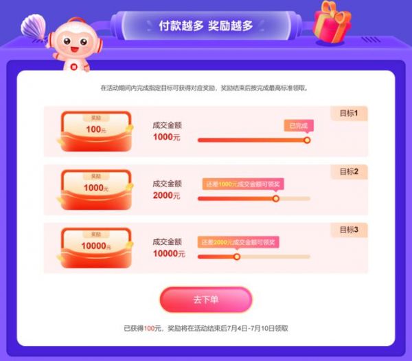 5月成交的金额设为6月成交的目标,共分3个档位目标,完成不同指定成交金额,即可获得对应奖励!奖励金额按最高完成标准在活动后领取!像不像你最爱的闯关游戏?关键是还有实实在在的返利!不要白不要,商家们抓紧冲冲冲!