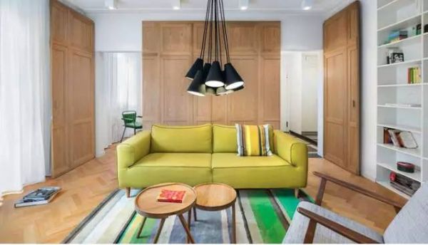 采用开放式的空间格局,将这做房子注入了生机勃勃的新鲜活力。客厅用很多木板门涉及,颜色亮丽的沙发搭配简单的地毯,旁边的白色书架也可以堆放书籍和小物品,利用了小空间的面积,更便于收纳。