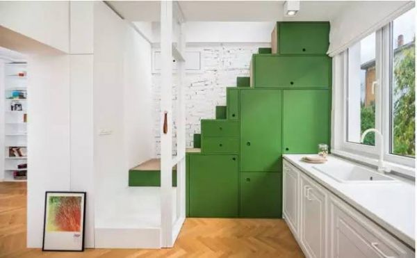 白色的开放式厨房,干净大气。楼梯下面还设计了隐藏的收纳柜,采用亮丽的绿色,不仅实用还漂亮。