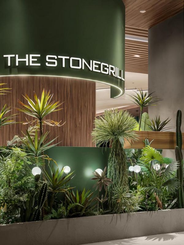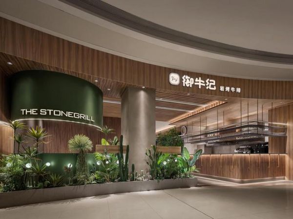 在高低错落的绿丛掩映间,强烈的色彩反差对比凸显御牛纪THE STONEGRILL的英文标识,链接深化符号记忆,帮助品牌实现有效的印象塑造。