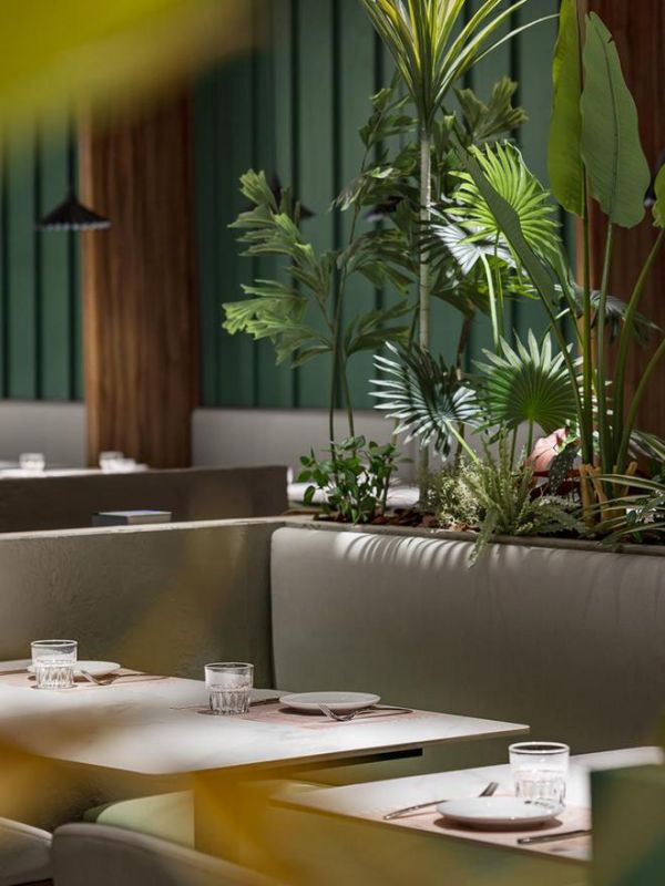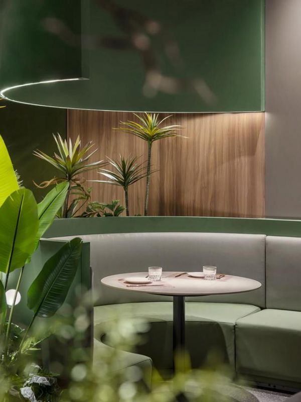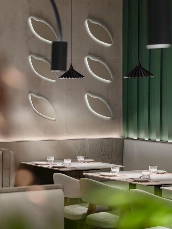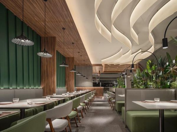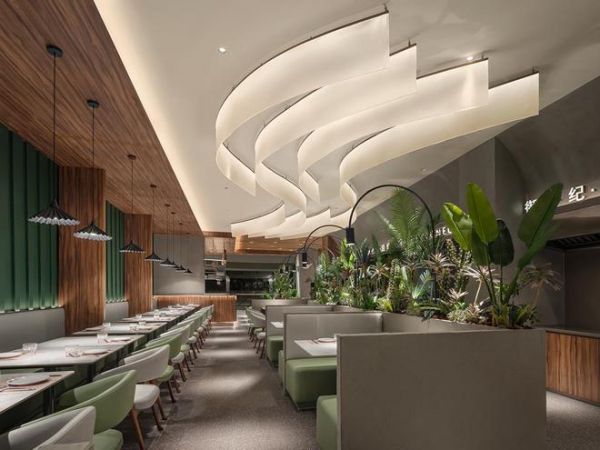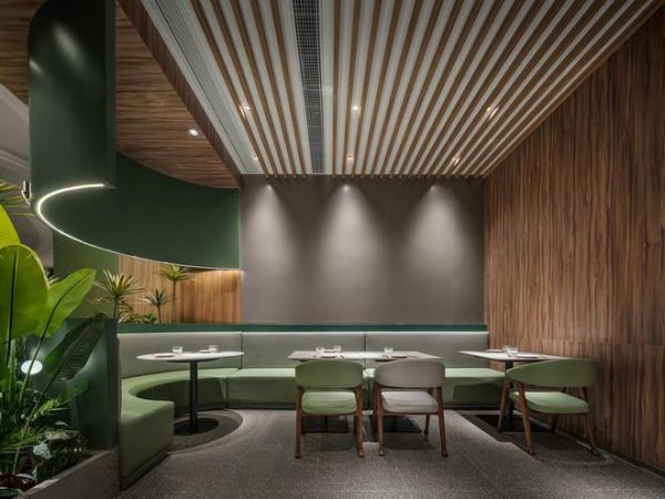 经过拆解与组合的树干造型投射成为连续的背景墙面,与低饱和度的浅灰色围挡、浅绿色的餐桌椅交织成空间的底色,宁静平和。