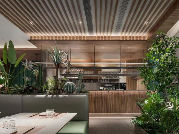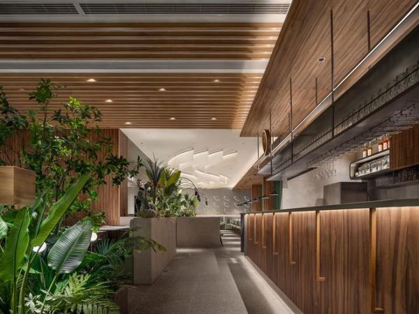 踱步进入森林,探寻自然的奥秘。对外是橱窗般绝佳展示位的观景台,向内则围合成半圆的小型卡座,一景两用,精致且淡雅。简练的天花铺装线条从就餐区向水吧延展,产生明确的交汇与秩序。