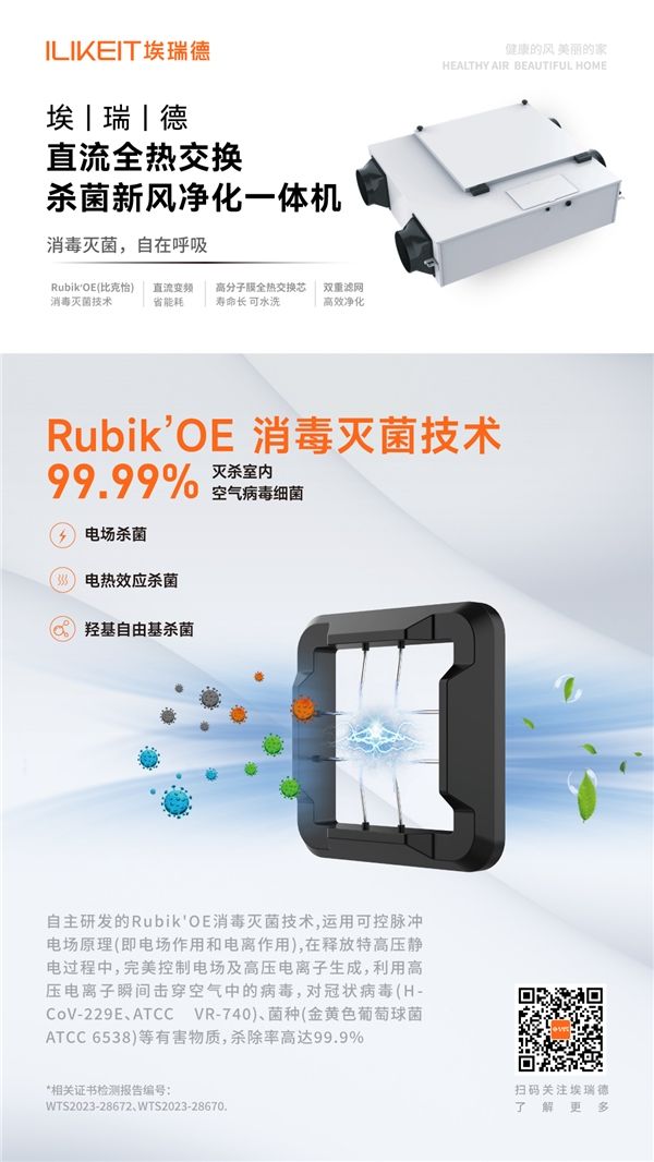 Rubik'OE 是埃瑞德自主研发的核心技术,采用创新性的消毒方式,结合电场作用和电离作用,对空气中的病菌、病毒、细菌等有害微生物实现高效灭杀。经实验验证,该技术对冠状病毒、金黄色葡萄球菌等常见病菌的去除率高达99.99%,保障了室内空气的健康与安全,为用户带来更纯净、健康的呼吸环境。