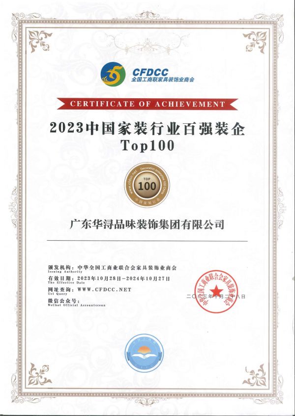 2003年,华浔率先通过ISO9001国际质量体系认证。目前已取得专项设计乙级资质、专项施工壹级资质,是中国建筑装饰协会副会长单位,中国家居行业品质建设成就理事会副理事长单位,全国各省市建筑装饰行业协会会长/副会长单位。迄今为止,先后获得了200多项重磅荣誉;已在全国20个省(直辖市、自治区)的200多座城市开办了200多家直营公司;成立了高端设计机构(HA艺墅设计院)和好屋安整装公司;创建了实时在线工地管控平台(华浔管家APP);建立了九重质检体系、三级客户服务体系和全国品质统一联保体系;累计服务客户超过200万户,赢得了良好口碑和市场份额;出版了60多部文化类、设计类和工程类专著;取得了数十项工艺技术国家专利。
