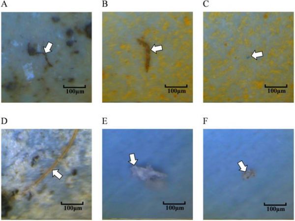 从人类肺组织样本中鉴定出的微塑料图像(A=PET、B=PUR、C=Resin、D=PAN、E=PS、F=PP)