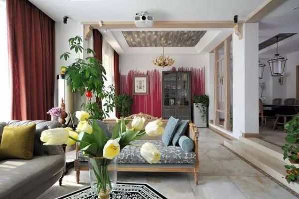 客厅选用了欧式风格的沙发,整体空间开阔明亮,茶几上的鲜花漂亮清新。