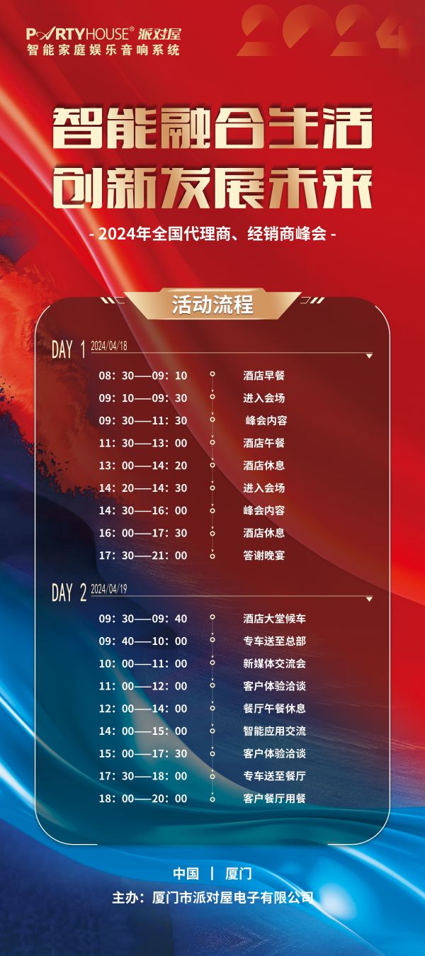 在过去一年的时间里,Partyhouse派对屋不断探索,不断突破,对企业未来发展方向有了新的规划。为了共同搭建交流平台,实现合作共赢,由厦门市派对屋电子有限公司举办的“智能融合生活,创新发展未来——派对屋2024年度全国代理商/经销商峰会”将在厦门汉景华美达广场酒店拉开帷幕。此次大会我们将共同探讨智能家居与智能影K融合发展的趋势和企业未来发展的方向。届时,Partyhouse派对屋音响新品也将同步亮相本次会场。