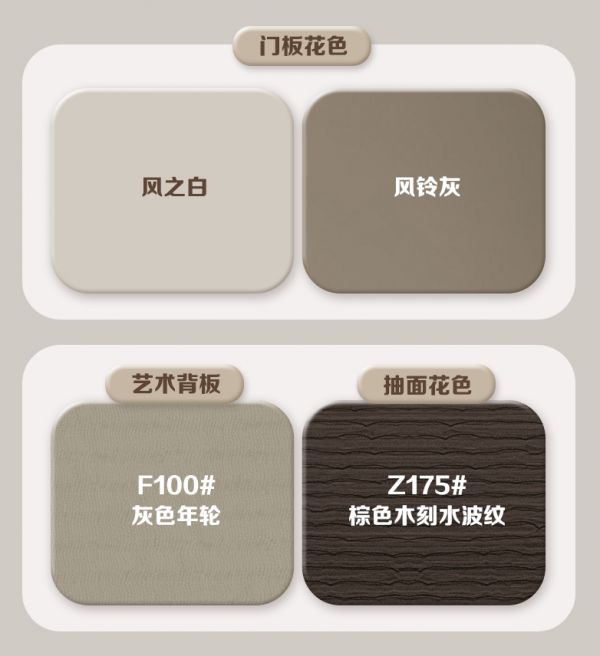 「山系+」橱柜系列板材的花色,以灰、白、卡其等低饱和度浅色为主。风之白、风铃柔和温暖,带来一抹宁静与安逸;灰色年轮与棕色麦穗木纹自然融入,凸显原始恬静之美,沉稳又不失轻盈。从柜门到柜体,色调的过渡由浅至深,消融了城市与户外的边界,仿佛将大自然的景致引入家中,带来全新的视觉体验。