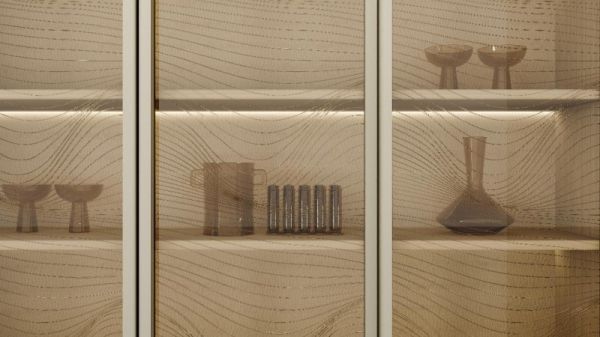 茶色水波纹玻璃柜门灵动朦胧,迂折萦回的线条演绎了似山又似水的形态,晕染出行云流水般的柔美之感。粼粼波纹在暖色灯带的映照下熠熠生辉,让厨房空间变得生动而富有活力。