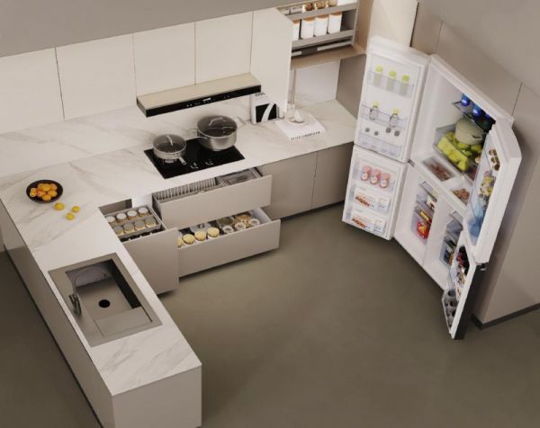 全友家居提供的个性化定制服务,可以满足不同消费者对于厨房布局的多样化需求。开放式L型布局,备菜、烹饪互不打扰,空间通透宽敞;围合式U型布局,推拉门有效区分空间,不惧油烟,储物力更强;一字型橱柜+岛台布局,格调西厨社交与下厨共欢乐,双倍空间双倍收纳。