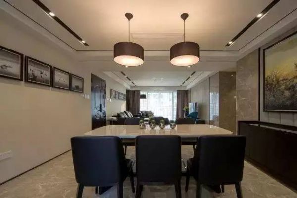3.走道在吊顶小射灯的照射下,显得很悠长。餐厅背景墙上的挂画,让餐厅氛围显得温馨起来,装饰性还是很强的。
