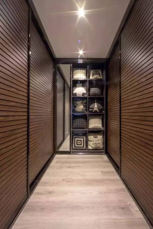 5.用各种图案不一样的抱枕填充在一个个小方格柜架中当作装饰,创意是不是挺好的。两侧的百叶窗拉上在小射灯的照射下,还挺有感觉的。