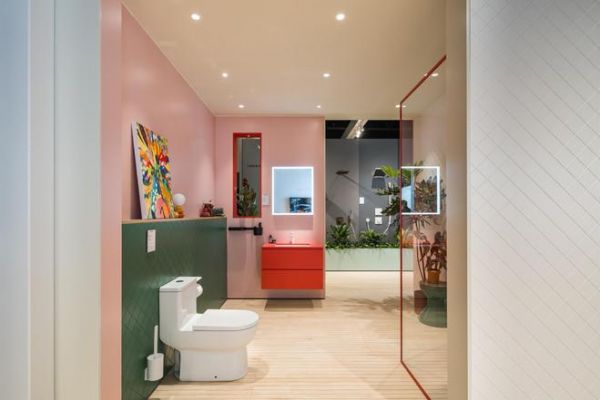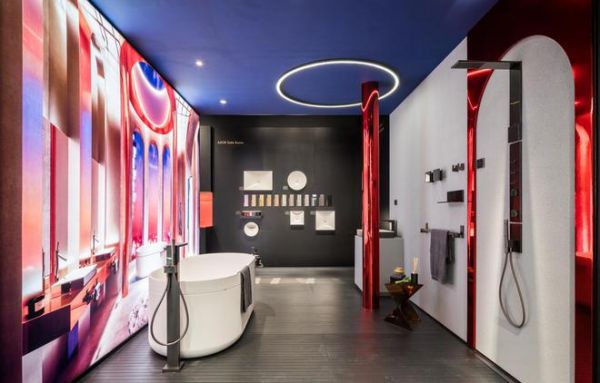 淋浴区全新的明装恒温淋浴系列ShowerTablet Select 360“小欧淋控”被呈现在多巴胺元素展间,搭配超大置物架,兼具年轻人颜控当先、多功能合一、简易操作等元素,诠释明快愉悦的年轻宣言。亮眼的大尺寸花洒,令水滴畅快包裹身体;轻触操作按钮,即可轻松切换出水模式;时尚外表下温控安全锁、恒温阀芯的设计细节,时刻守护用水时的安心自在。小身材,多功能,灵活明装,亲民定位,汉斯格雅为日益年轻化的淋浴需求倾注创新与诚意。