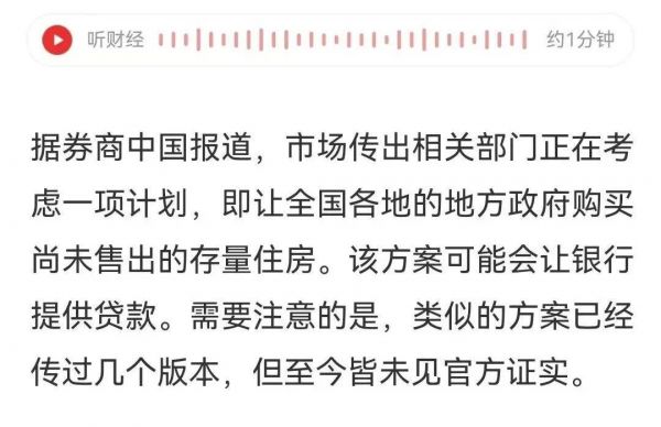 相关部门正在考虑一项计划,即让全国各地的地方政府购买尚未售出的存量住房,改成保障房。该方案可能会启动国债或者让银行直接提供贷款,启动资金规模庞大。