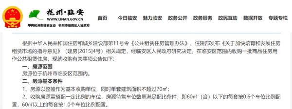 在消息发出后,杭州市临安区住房和城乡建设局发布公告称,经临安区人民政府研究决定,将在临安区范围内收购一批商品住房用作公共租赁住房。