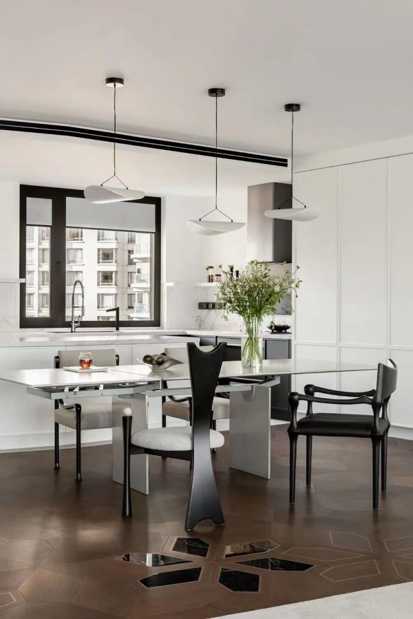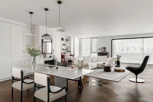 本设计方案面积在170平,属于时下非常受年轻人喜爱的大平层户型。设计师将白色调作为本案的主色调,极致简约的白,加上轻奢范的后期软装配饰,使得整个空间呈现出一种静谧与高雅的艺术空间氛围。超大的客餐厅一体设计是本案最大的亮点之一。