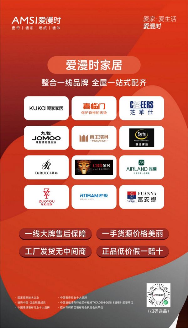 与此同时,服务品质也成了消费者提升消费“幸福感”的一大因素。为了满足消费者对一站式软装搭配的需求,爱漫时打造更全面的家居产品体系,拥有窗帘、墙布、墙纸、墙贴、墙咔等多种类软装产品,根据每户家庭的不同需求提供各有特色、协调美观的软装搭配方案,当下大热流行的极简风、奶油风、中古风、新中式、北欧风都包含其中。