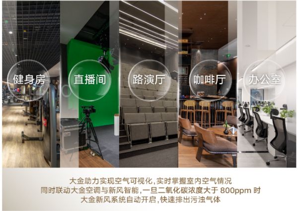 大金基于多年以来积累的大量复杂空间丰富的实践经验,根据成都中海OFFICEZIP项目实际需求,选用大金智能便捷的VRV intelligent系列,对人员复杂的成都中海OFFICEZIP项目共享办公区域,提前布局独立的大金新风系统,并结合项目内会议室、路演厅、健身房等不同区域特点,设计特殊的新风口气流走向。