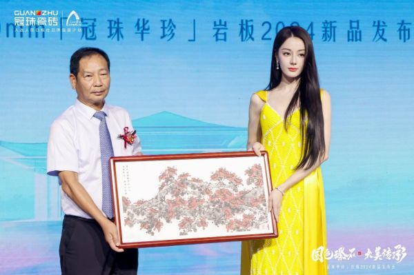 多年来,从“每一块都很美”到“大美筑家中国冠珠”的美美与共,冠珠瓷砖与品牌代言人迪丽热巴始终在大美同行。为答谢冠珠瓷砖品牌代言人迪丽 热巴亲临助阵发布会,以及一直以来对品牌的支持,新明珠集团董事长兼总裁 叶德林赠送代言人迪丽热巴专属定制的艺术岩板画。