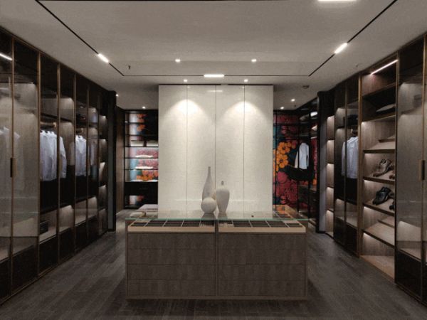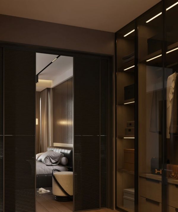 现代简约的设计也能在视觉上平衡家庭空间,木材与玻璃的搭配,和谐又自然,平开门衣柜,大空间挂衣区真的太幸福!