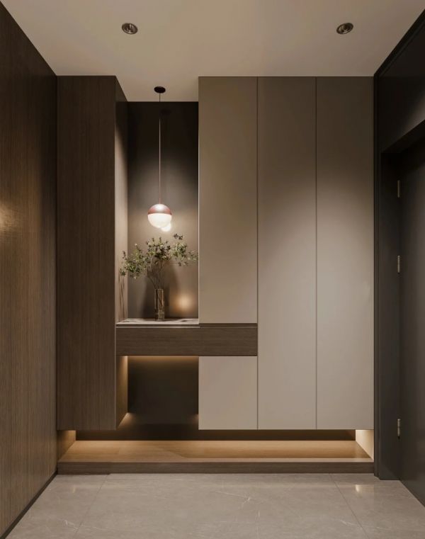 玄关处强化视觉效果,增强入户仪式感。鞋柜中间开放格,均安装了嵌入式感应灯带,入户既亮,提升氛围感和照明!回家再也不用抹黑了~