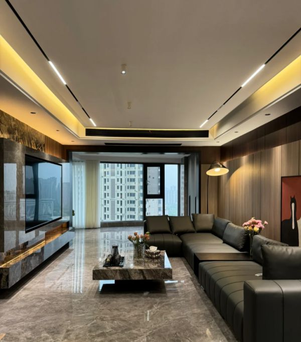 客厅、餐厅、厨房等公共区域采用开放式设计,增强空间的通透感和互动性。沙发墙也以木饰面硬包+格栅装饰,精选银丝直板材质,很显档次!电视背景墙的大理石纹与木纹饰面以自然原始的肌理,为空间注入无限生机,搭配灯光,空间更加有氛围感,含蓄而高级。