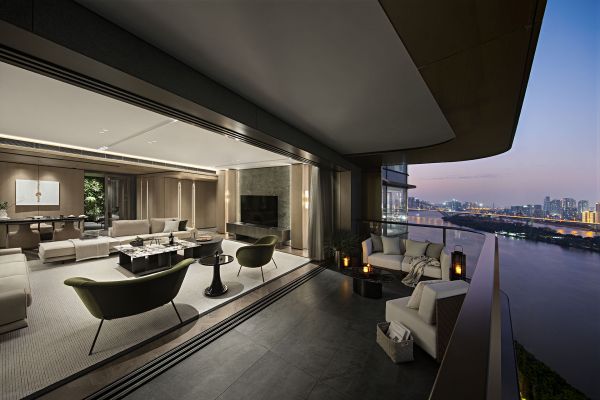 室内以流畅动线划分成不同的社交空间,紧连 16 米的超长景观阳台将室内与大自然连结,180° 视野的旖旎江景令人赞叹。