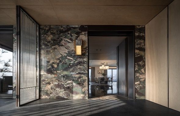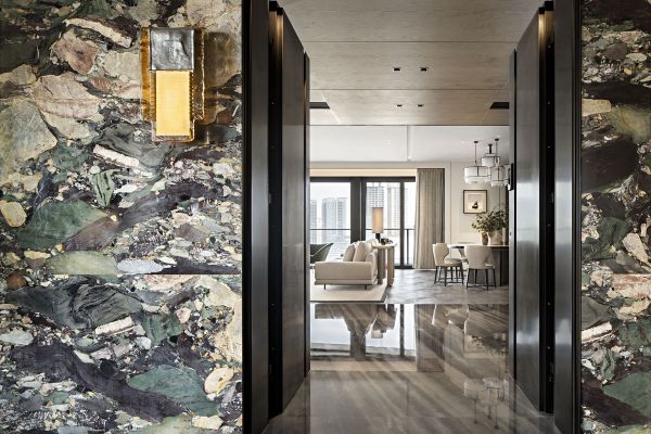 步出独立入户电梯厅,来到入户花园,可见墙身选用了源于法国的四季绿石,经典祖母绿搭配俏皮的粉色,展现了设计师引绿意入户的巧思。