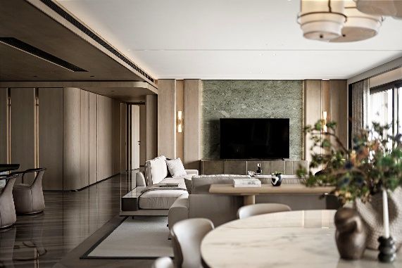 南天名苑项目承载着开发商和设计师对于广州人居升级的共同美好愿景,开启了城央岛居全新的生活方式,于大平层空间实现了别墅型的居住空间规划,通过流畅的动线无缝衔接室内外空间。整体设计以中性木色为基调,选用橄榄绿色贯穿不同区域,将户外的清新绿意延伸至室内,打造岛居生活宁谧、柔美自然氛围。