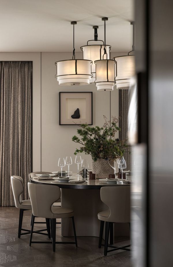 和谐的色调与简约利落的线条,配上得天独厚的一线江景,奠定整体舒适平和的氛围,搭配精品家具、软装布置与艺术品,让空间更添诗意。客厅沙发选用了意大利奢华手工家具制造商 TURRI 的米色调组合沙发,线条利落大方;橄榄绿色单椅是意大利品牌Molteni&C 的代表作品 “爱之椅”,背靠于景观阳台勾勒出其优雅弧度;沙发与单椅两者从色调与线条上互相映衬。餐厅以米色为主调,大理石餐桌配以精选国内设计品牌班兰的蝴蝶餐椅,正上方垂吊着现代灯笼造型的吊灯,灯罩材质为日本手工和纸,设计细腻精致。餐厅旁的半分隔墙体上悬挂着新锐艺术家吴笛笛的版画作品,描绘出一片充盈的绿岛,象征着大自然的生机,与地理位置相呼应,为素净淡雅的餐厅抹上一份诗意。品茗区家具选用国内设计品牌素壳,富有东方现代韵味,而艺术品选择了以东方艺术哲学的留白作为基础的木雕工艺品,为静心品茗的独立空间营造出清净的氛围。主卧套房的双人床选用了意大利奢华家居品牌 GIORGETTI 的 KAO 系列,典雅而不失时尚。