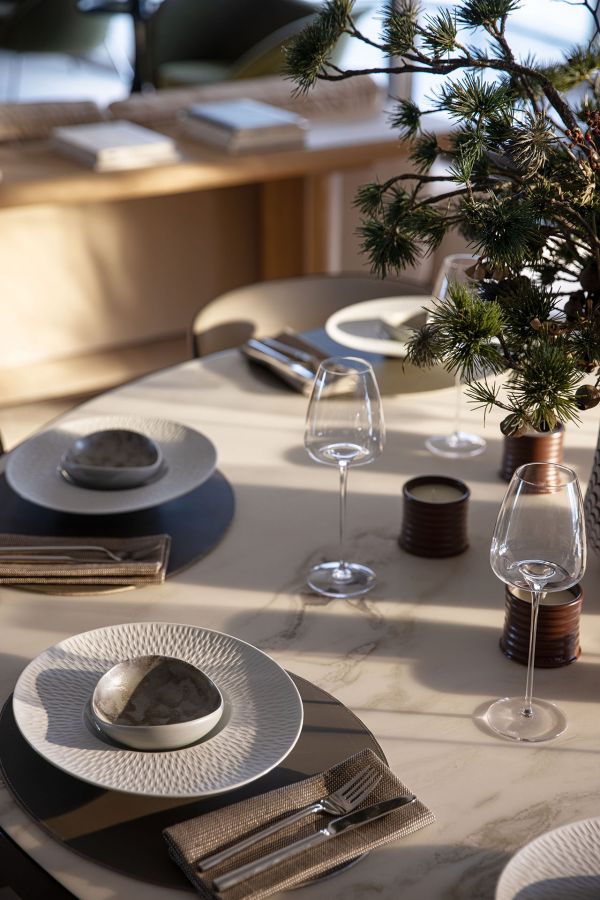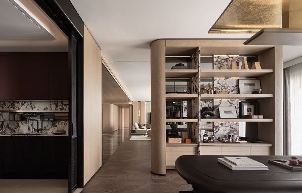 室内以流畅动线划分成不同的社交空间,紧连 16 米的超长景观阳台将室内与大自然连结, 180° 视野的旖旎江景令人赞叹。整体客厅区域除了客厅和餐厅,还特别以半开放的分隔墙划分出多功能休闲区和品茗区,让两区之间自然过渡,令空间更见宽裕且功能多元百变,提升了亲友欢聚的体验。客厅电视墙选用了瑞士翡翠石,独特的肌理感尽显低调奢华。多功能区柜体以源自意大利的宝格丽紫石作为点缀,自然高雅。开放的空间摆放了长桌及椅凳可满足家庭日常用餐需求;而西厨以及意大利品牌 Arclinea 双门酒柜等配置,使其成为低调而奢华的会客社交场所,可宴请亲朋在此品酒畅谈。厨房连同工作间均选用同款宝格丽紫石及独特色调的柜体,将两处空间合二为一,令空间更显华丽、通透开阔。