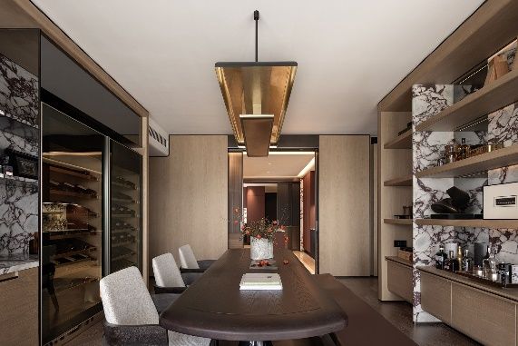 多功能区柜体以源自意大利的宝格丽紫石作为点缀,开放的空间摆放了长桌及椅凳可满足家庭日常用餐需求;而西厨以及意大利品牌 Arclinea 双门酒柜等配置,使其成为低调而奢华的会客社交场所。