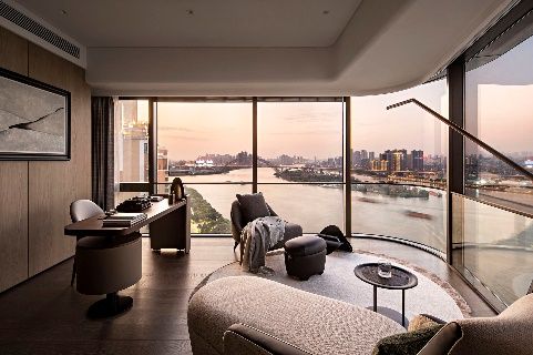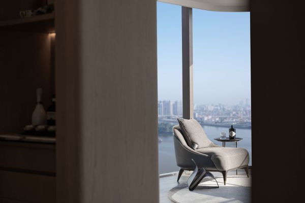 主卧室的大面积弧形落地窗畔安放着舒适的沙发组合,让户主可享受专属的 270° 落日美景,感受无可比拟的自然平静。