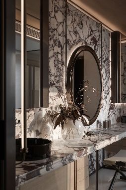 主卧浴室以宝格丽紫石铺砌,其丰富肌理彰显石材的生命力,配备超长双洗手台兼女户主的梳妆空间,尽显奢华气度。