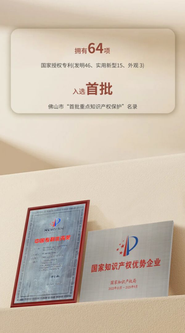 宏陶瓷砖拥有佛山、清远、宏胜3大基地、5大工厂,借助集团科研创新平台实力,通过装备、工艺技术的突破升级,形成了多品类、多规格、多花色的产品领先优势。更重要的是,宏陶瓷砖多年来坚持创新关键技术,并以技术力量牵引,将创新成果转化成自主知识产权,多措并举推进知识产权运用效益,助力市场竞争力一直处于行业领先水平。截止目前,宏陶瓷砖拥有国家授权专利64项(发明46、实用新型15,外观3)。入选佛山市“首批重点知识产权保护”名录,并于2018年获得国家级政府奖项、专利行业的最高奖项“中国专利优秀奖”。2019年荣获知识产权管理领域的最高荣誉“国家知识产权优势企业”!