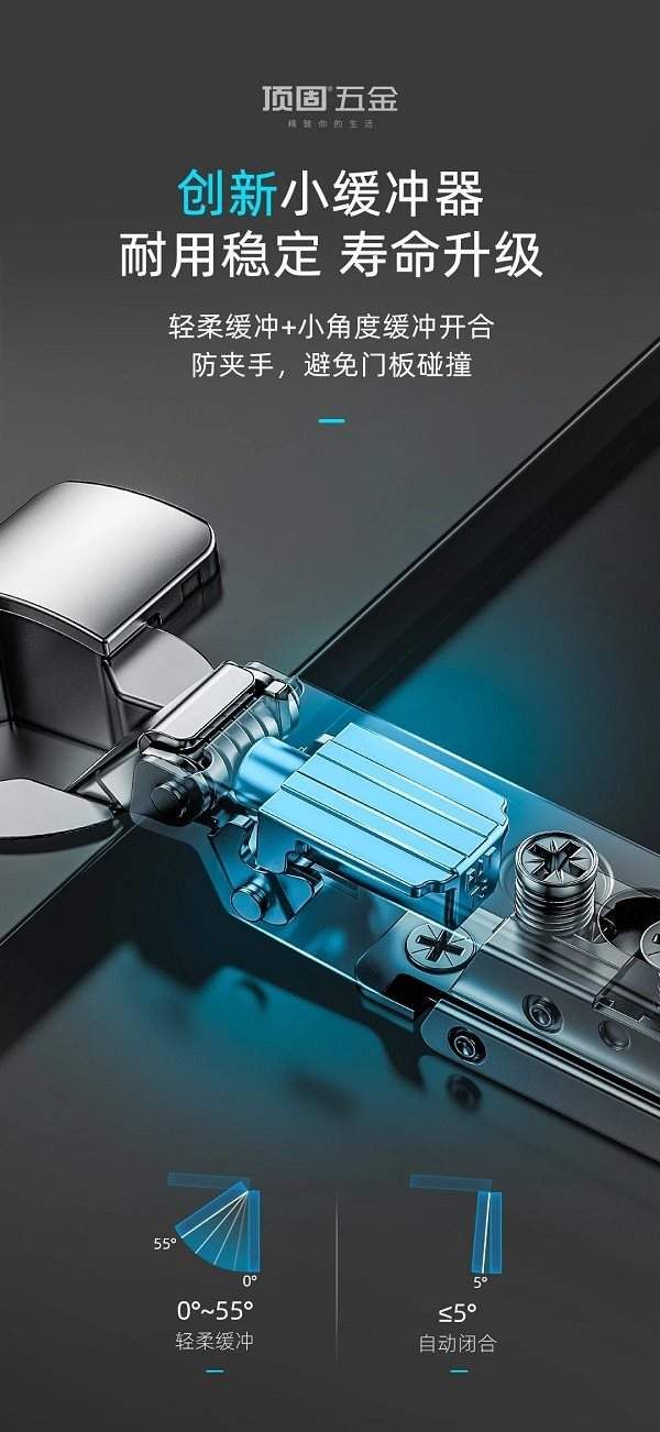 不仅如此,顶固顶承系列一字静音阻尼铰链还采用了创新的小缓冲器设计。这种轻柔的缓冲效果,不仅能够防止门板在关闭时产生碰撞,还能有效避免夹手的风险。无论是家中的老人还是小孩,都能在使用时感受到它带来的安心与舒适。同时,这种小缓冲器还具备耐用稳定的特点,使用寿命得到了极大的提升。