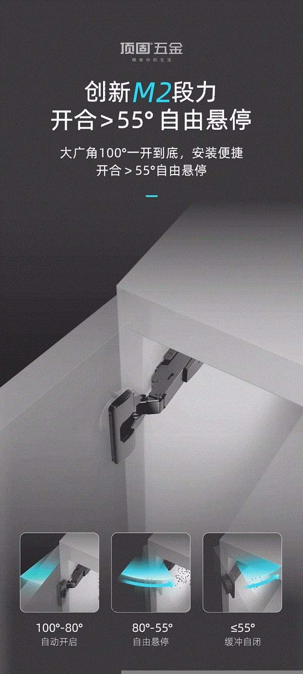 这款新品铰链的独特之处,首先在于其M2段力设计。当柜门开合角度在55°-80°之间时,它能够实现自由悬停。这意味着,无论你在厨房忙碌地取用调料,还是在卧室精心挑选衣物,都能轻松地将柜门停留在任何你需要的角度,取物变得更加便捷。而当柜门小于55°时,它会自动缓冲闭合,避免了柜门意外关闭时可能带来的噪音和安全隐患,真正做到了安全省心。