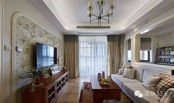 ▲ 客厅电视背景用线条框了一个弧形,中间铺满壁纸